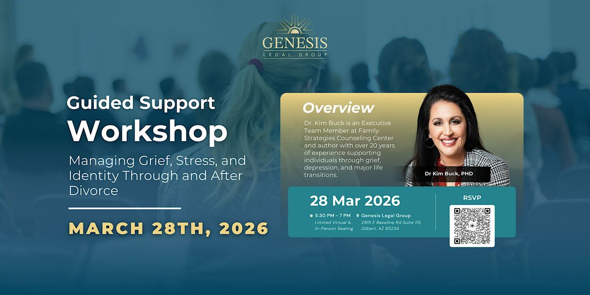 This in-person and virtual workshop is designed for anyone currently going through divorce or adjusting to life after it. Dr. Buck will share practical, therapist-guided tools to help you regulate emotions, stay grounded during stressful life events, and rebuild stability and clarity during a major transition. The event will be held at the Genesis Legal Group Mesa office with limited in-person seating available, along with a virtual option for those who prefer to attend remotely. Registration is required.