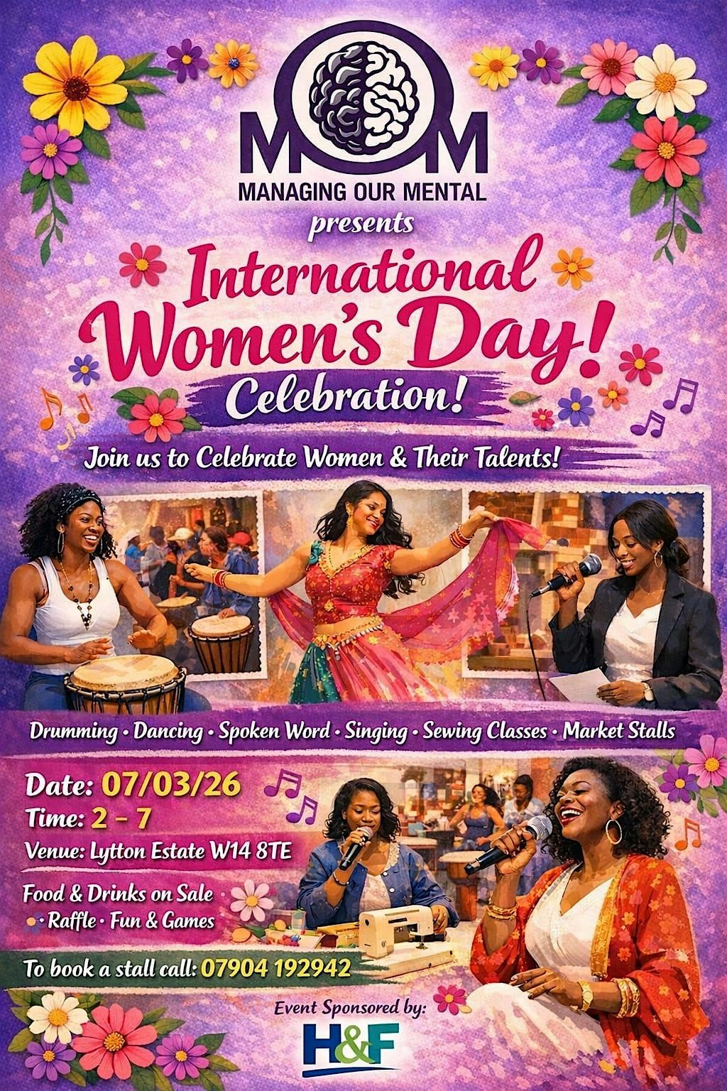 Welcome to Managing Our Mental's International Women's Day 2026! Join us at Lytton Estate Community Hall, W14 8TE on Saturday March 07th between 14:00-19:00 for an empowering event celebrating talented women from across the world. Let's come together to enjoy activities such as drumming, dancing, spoken word, singing, sewing classes, market stalls and more. This event is a safe space for women to connect, grow, and thrive. Don't miss out on this opportunity to celebrate International Women's Day with us!
