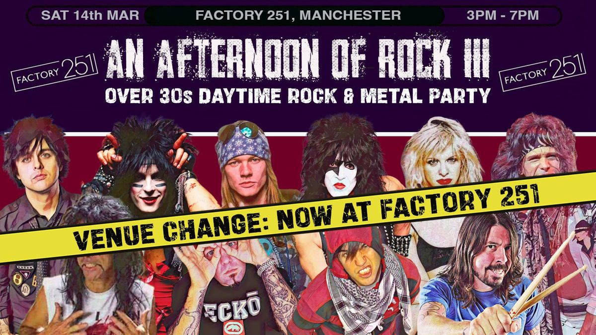 **PLEASE NOTE CHANGE OF ORIGINAL VENUE. NOW TAKING PLACE AT FACTORY 251**An Afternoon of ROCK & METAL is returning to MANCHESTER to bring a daytime rock and metal party to all you over 30s
