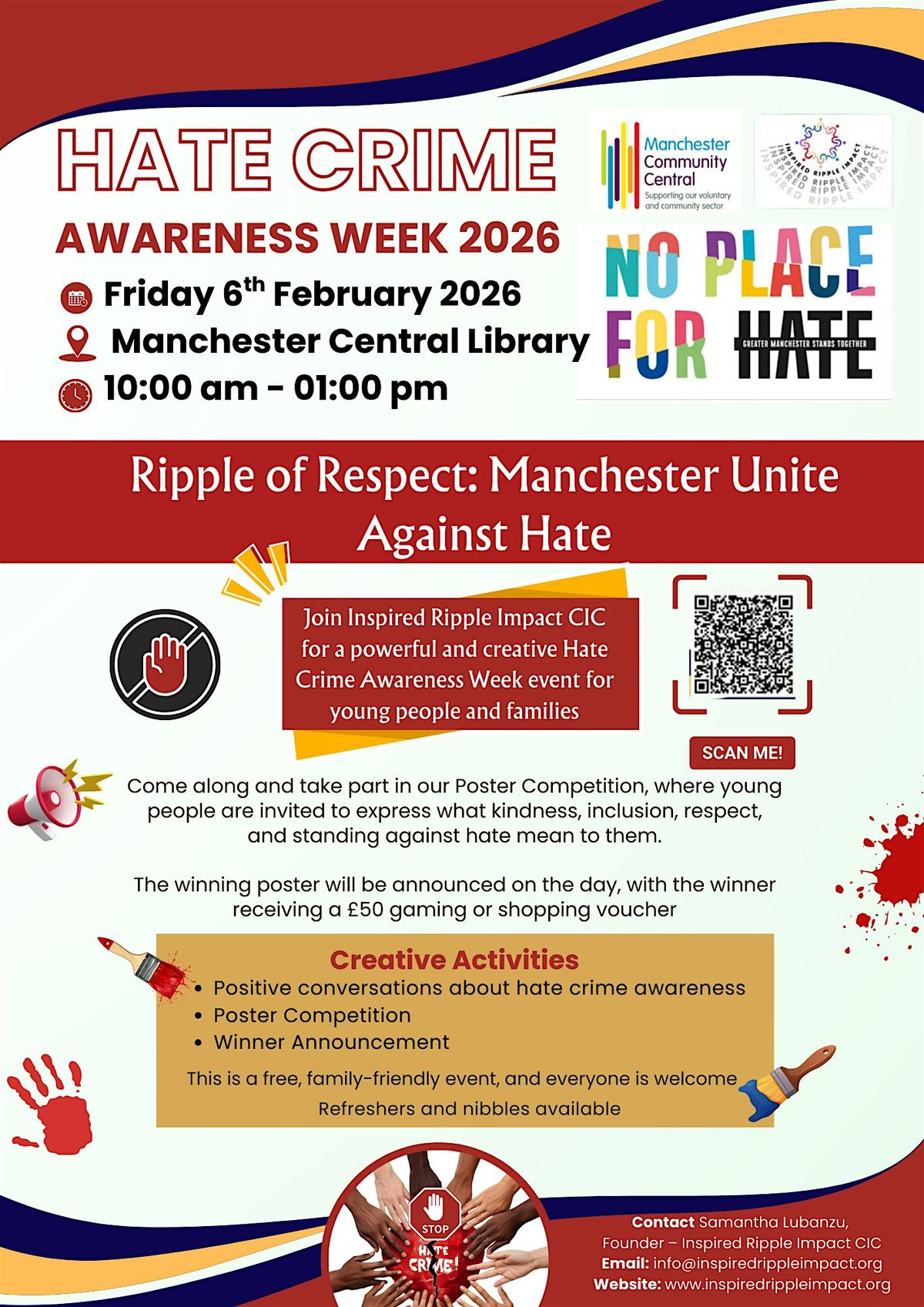 As part of Manchester Hate Crime Awareness Week, Inspired Ripple Impact CIC invites residents, families, and community members to take part in a powerful creative and community-led dialogue event focused on unity, respect, and standing together against hate.