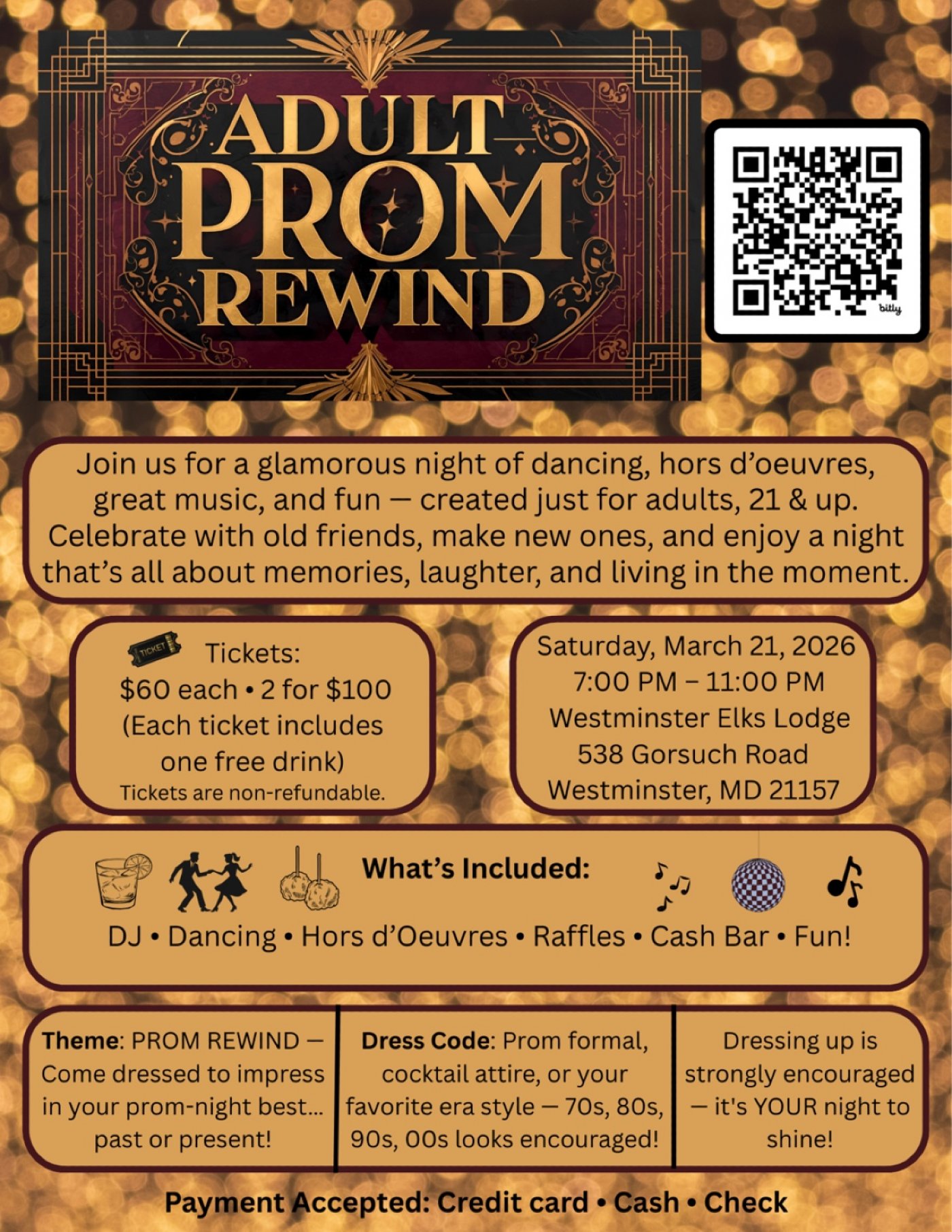 Join us on Saturday, March 21, 2026 from 7-11PM at the Westminster Elks Lodge for our Adult PROM REWIND. Dance through the decades as you enjoy music from our DJ, lots of appetizers, raffles, and a cash bar. All proceeds go to help the Manchester Valley High School instrumental, vocal, theater, and dance programs. Why not have a lot of fun as you support the performing arts students?!!