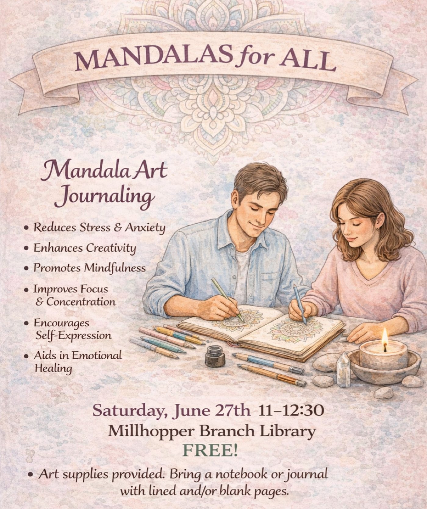 Participants will need to bring a notebook or journal with lined or blank sheets or both. It an even be an old book as we will paint over the pages. Art supplies will be provided. Being on time is essential so you don't miss the power point presentation.