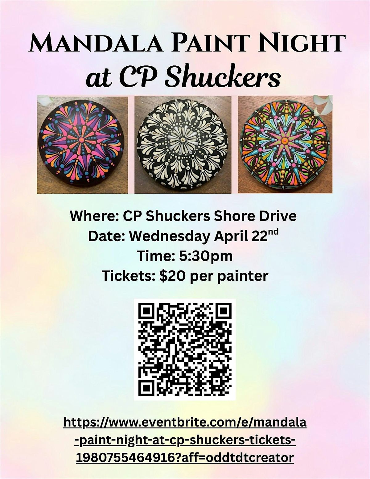 Come join us for a fun Mandala Paint Night at CP Shuckers! Whether you're a pro or just looking to unwind, this in-person event is the perfect chance to get creative, sip on your favorite drink, and hang out with awesome people. All materials will be ready for you—just bring your good vibes and let the colors flow. Don't miss this chill night of art and laughs!