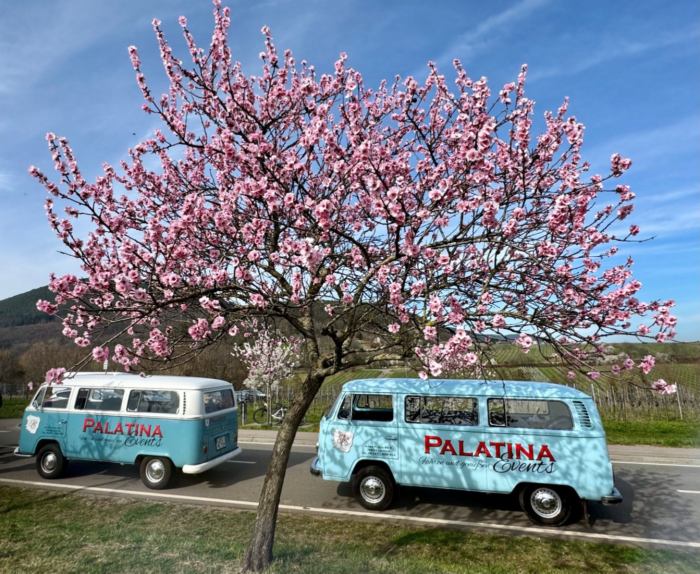 Erleben Sie die Pfälzer Weinlandschaft im Kleid der Mandelblüte bei einer nostalgischen Fahrt im Oldtimerbulli.