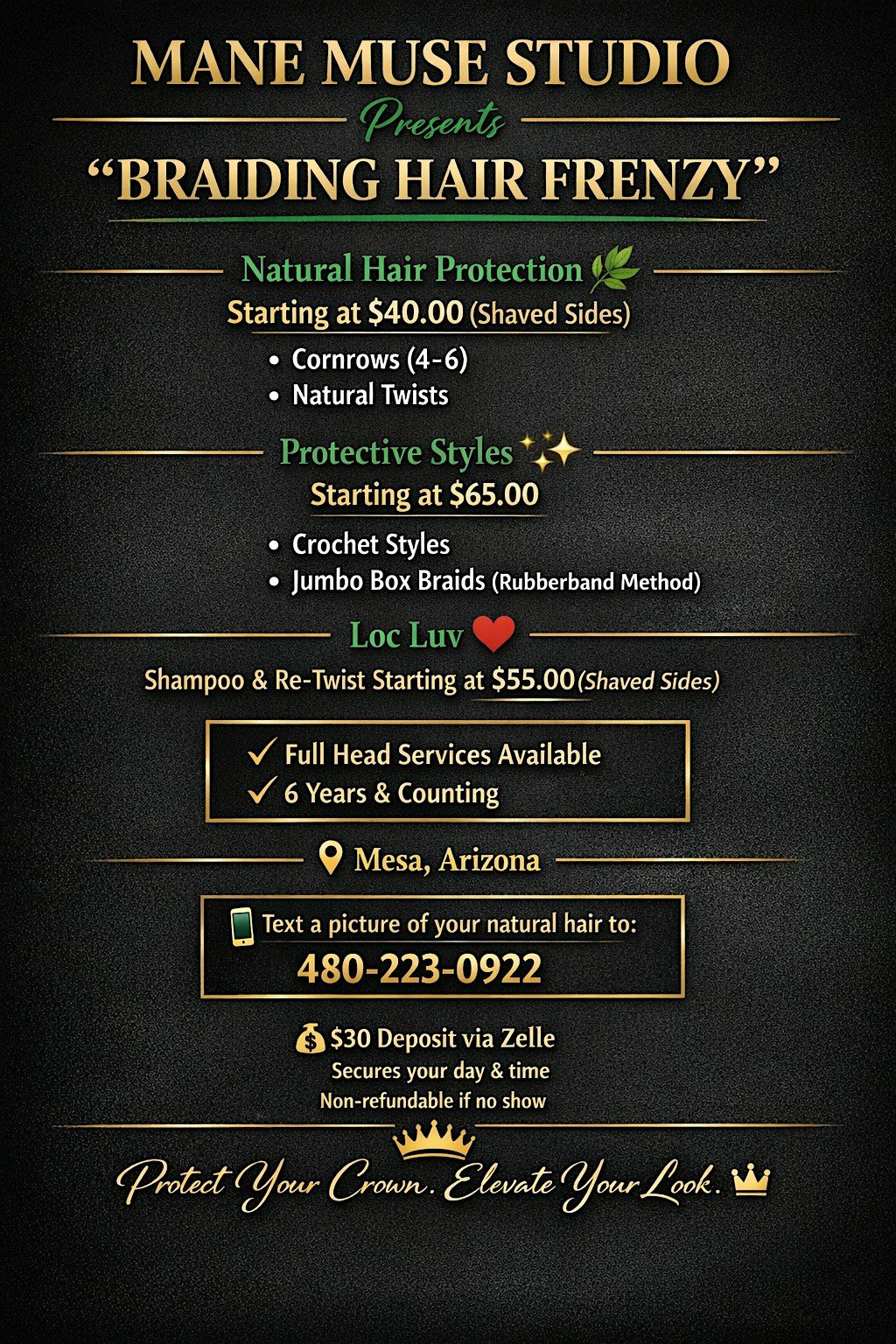 #MesaHair #PhoenixBraider #ProtectiveStyles #NaturalHairCare #LocMaintenance #BraidsByMe #HairFrenzy #ArizonaBraider #BookNow #CrownCare 👑