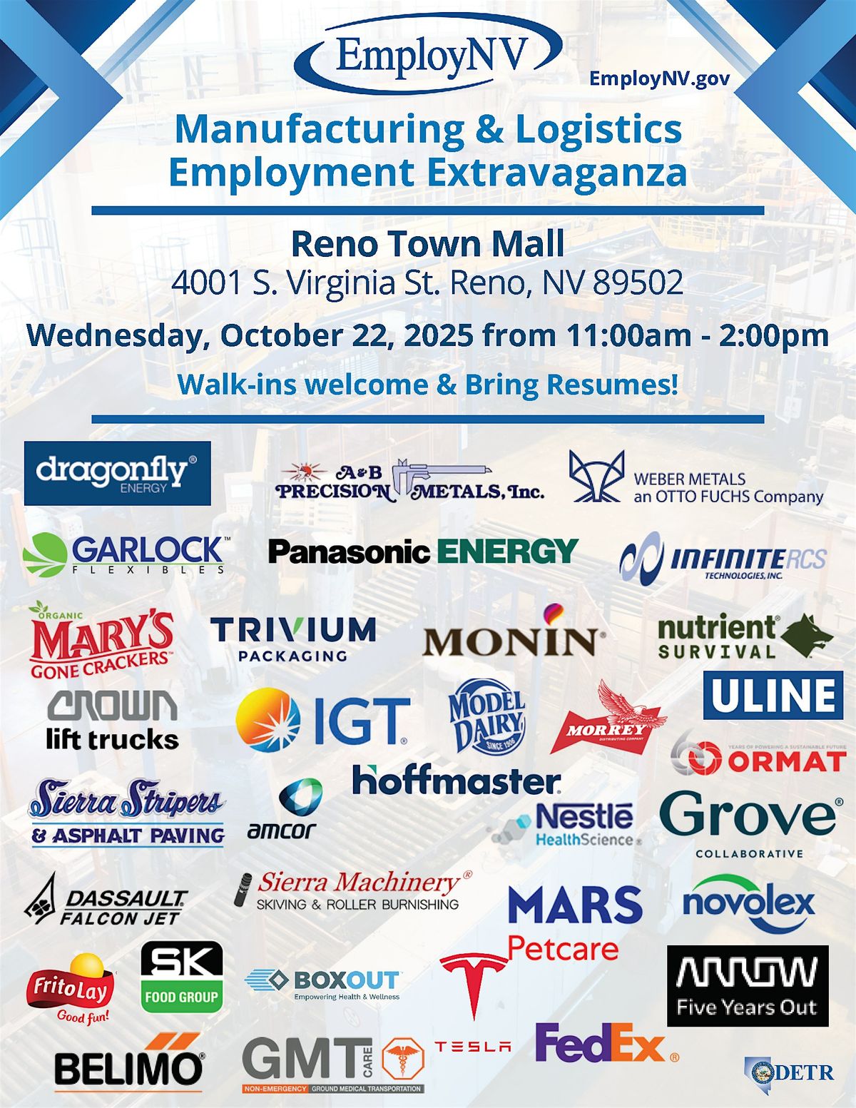 Employers include Ormat Nevada, Monin Inc, SK Food Group, Dragon Fly, IGT, Nutrient Survival, Arrow Electronics, Sierra Machinery, Grove Collaborative, Dassault Falcon Jet, Garlock Flexibles, Mary's Gone Crackers, Infinite Technologies, A&B Percision Metals, Tesla, Panasonic, Weber Metals, NOVOLex, Sierra Stripers, MARS Petcare, FedEx, Frito Lay, GMT Care, Nestle Health Science, Trivium Packaging, Morrey’s, Crown Lift Truck, Model Dairy, Hoffmaster Group, Belimo, ULINE, BoxOut, AMCOR, and more!