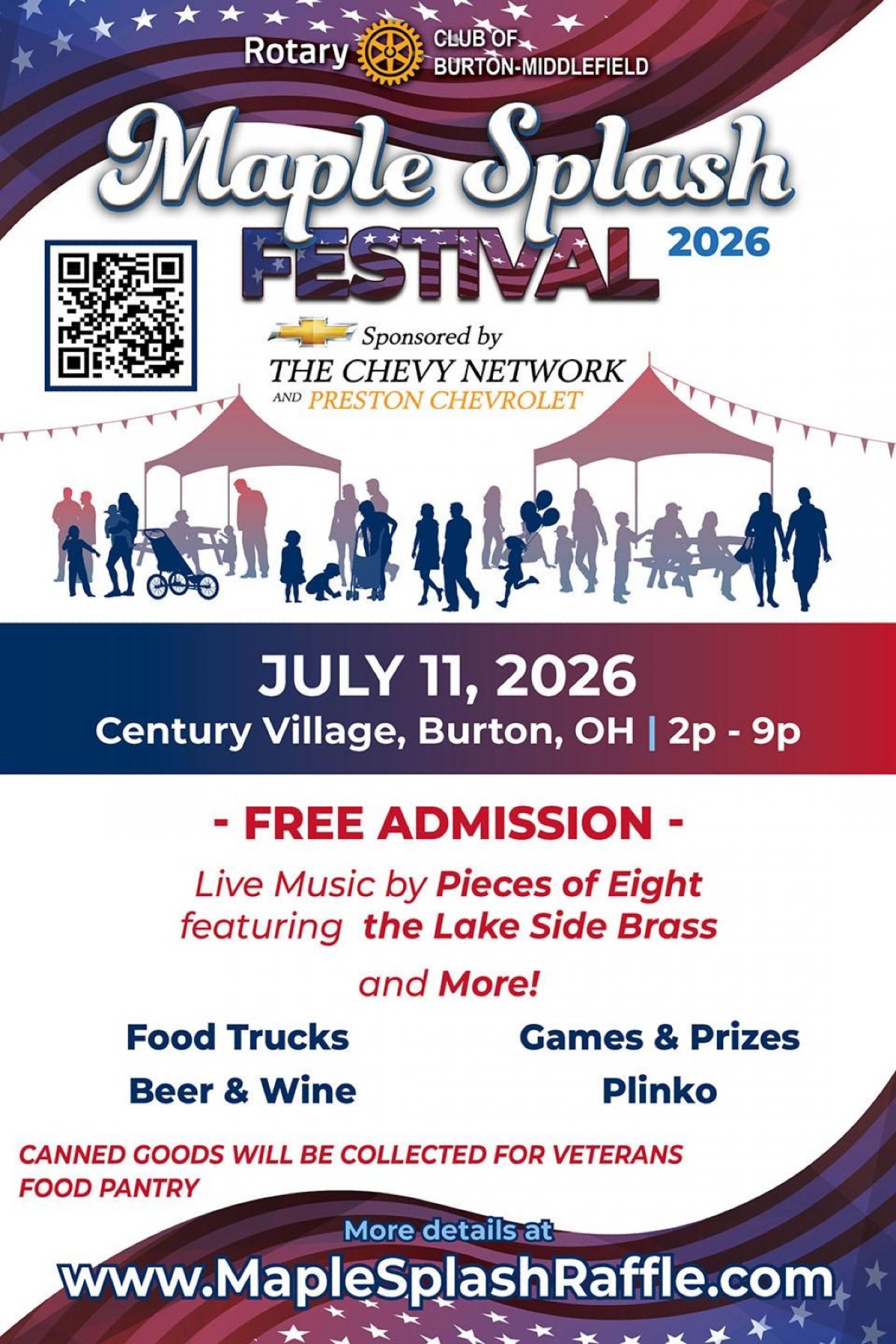 Join us for the Maple Splash Festival at Century Village Museum for the excitement of live bands: Pieces of Eight and the Lakeside Brass , food trucks -Wheely Good Food; Dilly Dilly Donuts CLE and more; games, a huge Chinese auction, Beer tent and of course, the Maple Splash Raffle where we will be giving away a 2025 Chevy Silverado 1500 Crew 4WD cab truck and other great prizes!! Bring your lawn chairs and friends and spend the day with The Rotary Club of Burton Middlefield while we raise funds to support our community. We will also be collecting non-perishable items such as canned goods and paper products for the Geauga Veteran's Food Pantry. Come have some fun!!