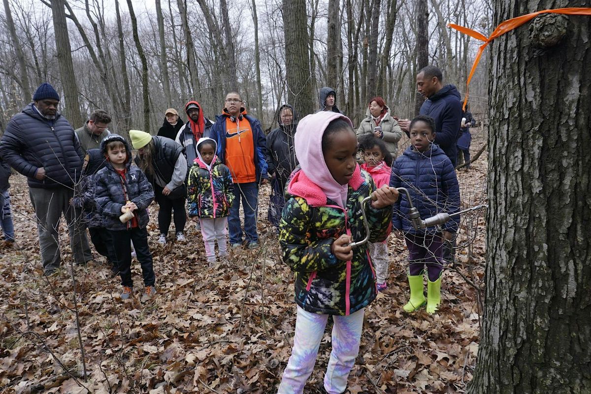 Dress warmly and wear good walking shoes — the trail can be muddy or slippery. This program is partially outdoors. The total length of the hike to maple trees about a 1/4 to 1/2 mile to the woods and back.