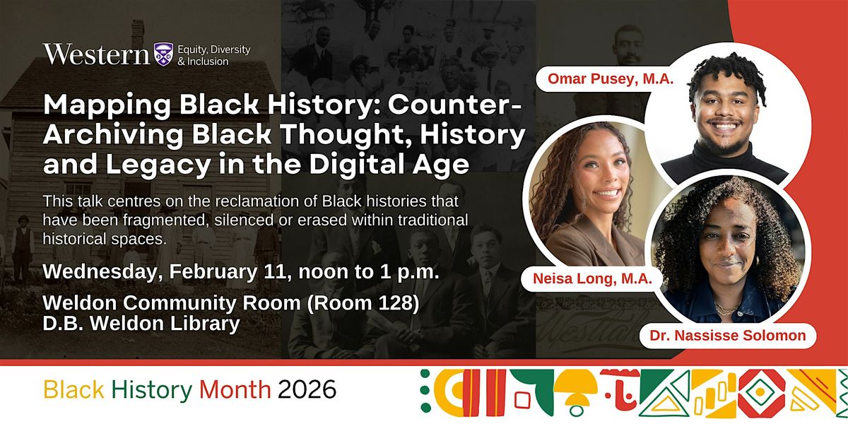 Aligned with Western's Black History Month 2026 theme of Black Joy, Glory, and Reclamation, join us as Dr. Nassisse Solomon, Neisa Long and Omar Pusey explore how Black history can be mapped, digitized, preserved and reimagined through multimedia and digital platforms as a form of counter-archival practice.