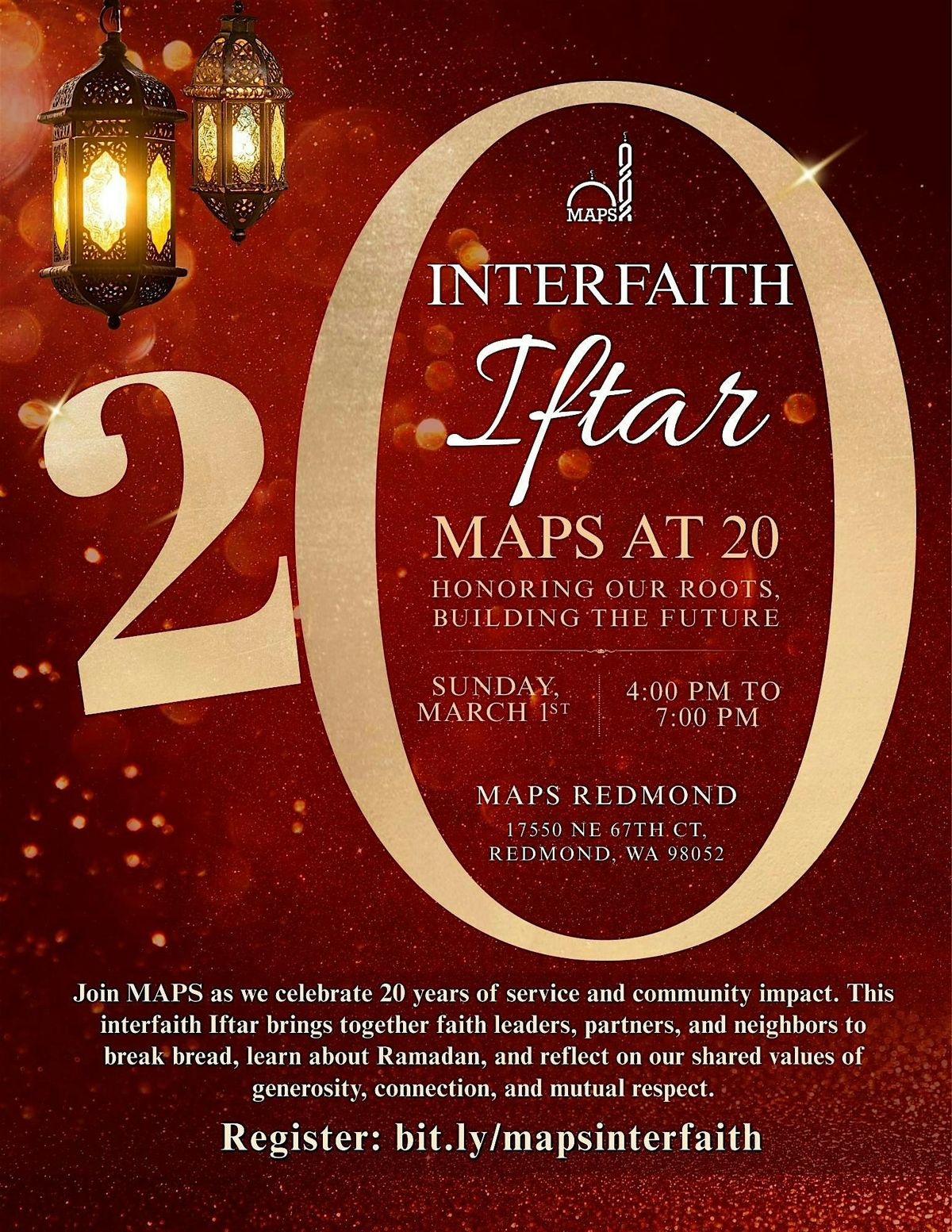 This year marks the 20th anniversary of the Muslim Association of Puget Sound (MAPS)—two decades of service, unity, and community impact. We are pleased to invite you to our Interfaith Iftar, held in the spirit of reflection, connection, and shared values.