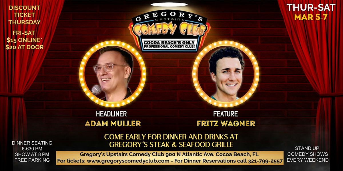 Come see the best touring comedians from all over the country performing every weekend at Gregory's Comedy Club. Enjoy upscale dining with the best local staff Cocoa Beach has to offer! Seating starts 2 hours prior to showtimes. This week New York based nationally touring comedian Adam Muller headlines (Youtube Special, West End Comedy Club) his clever intelligent brand of comedy has been made him popular with audiences all across the US and Canada, with Tampa favorite Fritz Wagner featuring!