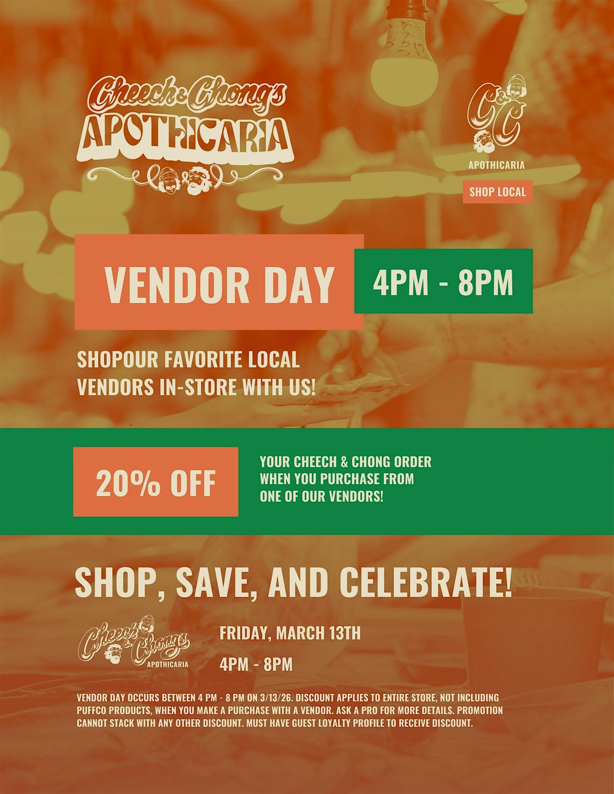 CBD Pros & Cheech & Chong Apothicaria Stores are looking for vendors for Friday, March 13th, 4PM - 8PM!