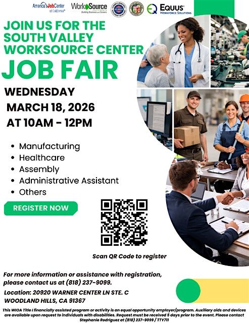 This WIOA Title I financially assisted program or activity is an equal opportunity employer/program. Auxiliary aids and devices are available upon request to individuals with disabilities. Request must be received 5 days prior to the event. Please contact Stephanie Rodriguez at (818) 237- 9099 / TTY 711 or email at [email protected]