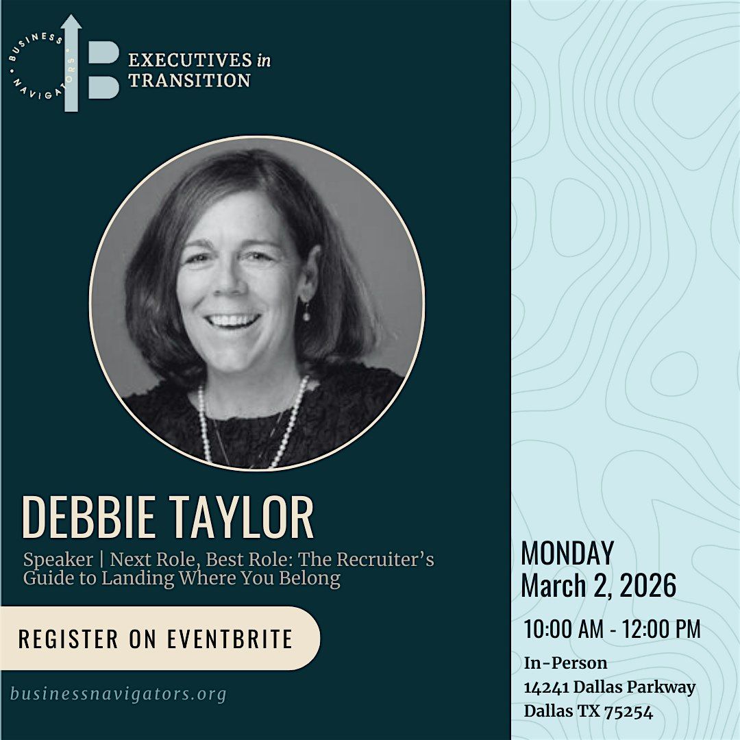 Business Navigators presents a series of live two-hour ZOOM meetings for you, our Executives in Transition, featuring a guest speaker on a core topic of interest. The intent of these live sessions is to enhance your network, inspire lively discussions, practice elevator pitches, form accountability groups, and share ideas, strategies, and helpful information with peers in transition.