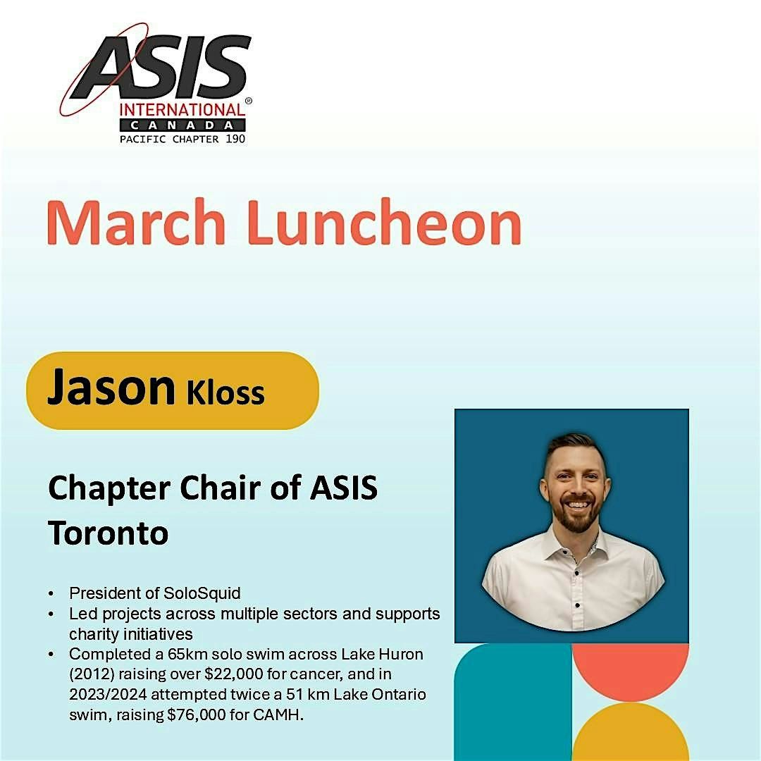 The ASIS Canadian Pacific Chapter 190n #Education_Committee and #Events_Committee are honored to invite you to attend our upcoming chapter luncheon featuring Jason Kloss, Chapter Chair of ASIS International Toronto Chapter 193 , to Vancouver for our upcoming ASIS Canadian Pacific Chapter 190 Chapter luncheon.
