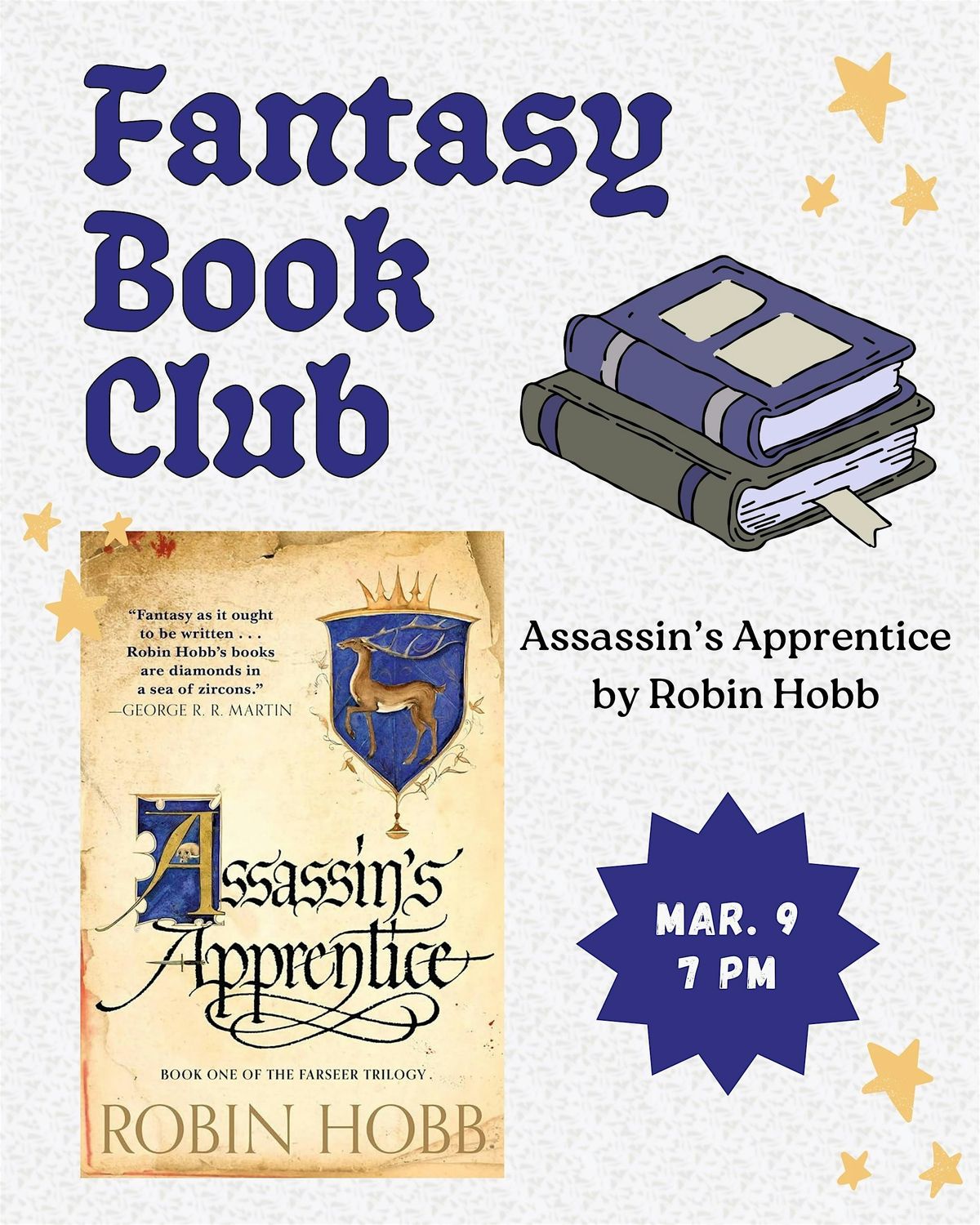 Join us for our monthly Fantasy Book Club discussion. For March, we will be discussing ASSASSIN'S APPRENTICE by Robin Hobb. Tickets are $5 and go toward store credit within the shop (and never expires).