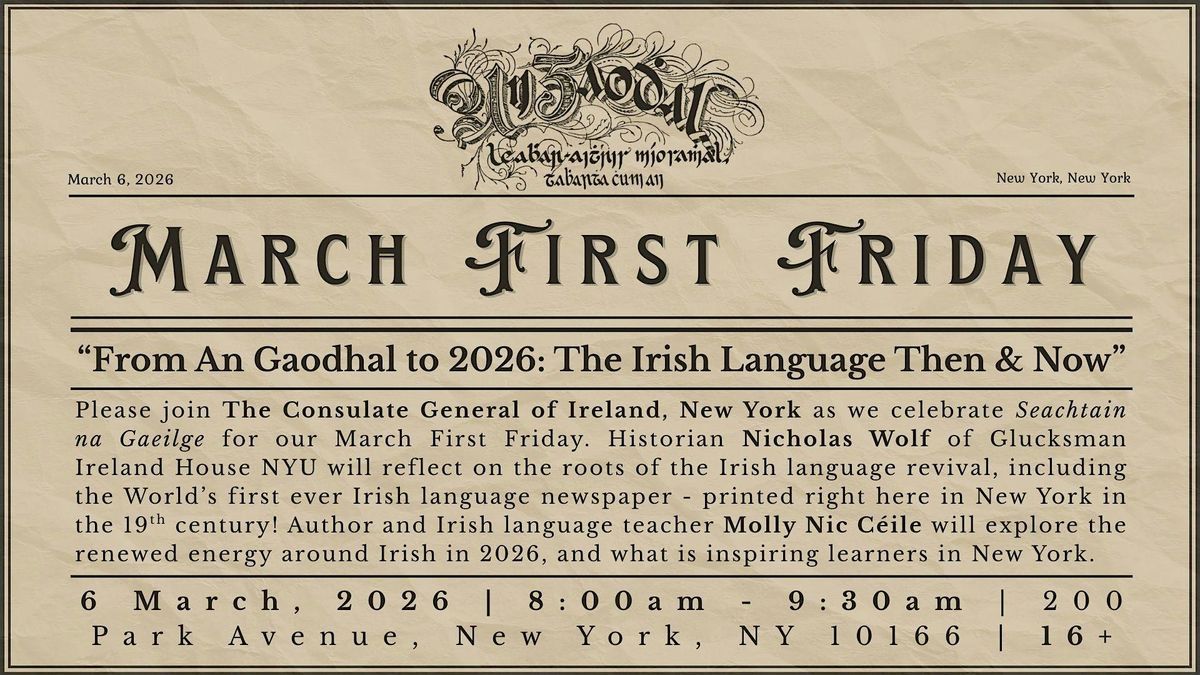 To mark Seachtain na Gaeilge, March’s First Friday explores the past, present, and future of the Irish language revival. Historian Nicholas Wolf of Glucksman Ireland House NYU will reflect on the historic roots of the movement, including his recent project digitizing An Gaodhal (1881), the first Irish-language newspaper published in the United States. Author and Irish language teacher Molly Nic Céile will discuss renewed interest in the Irish language in 2026, and what inspires people in New York to learn it today.