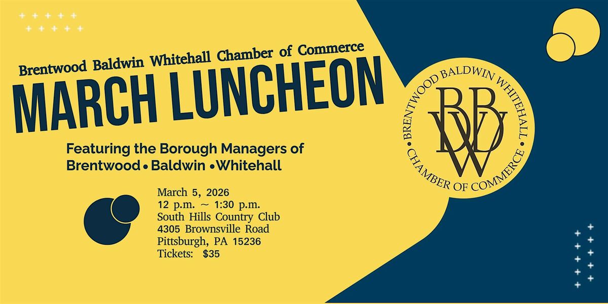 Join us for our March Luncheon at the South Hills Country Club featuring community updates from the Borough Managers of Baldwin, Brentwood, and Whitehall.