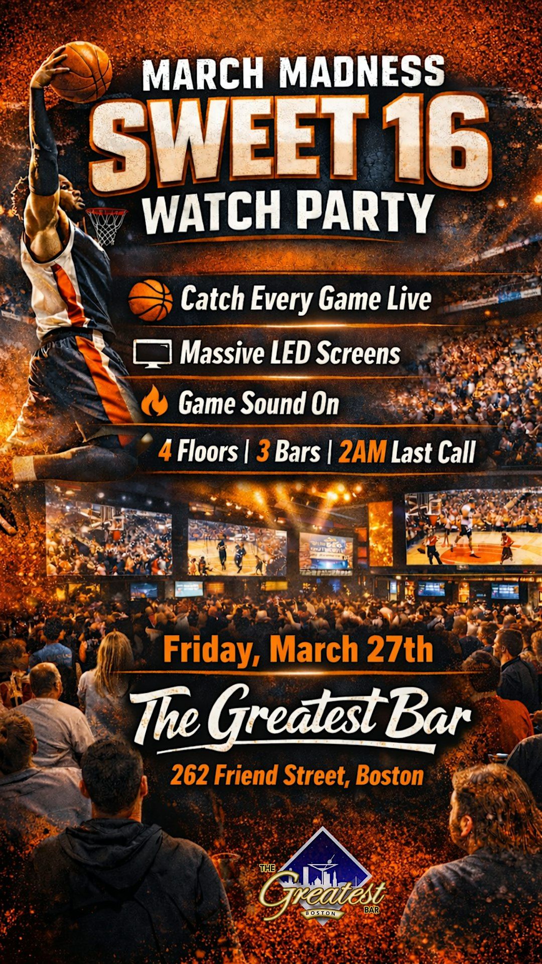The road to the Final Four heats up at The Greatest Bar on Friday, March 27th. Catch every Sweet 16 matchup live on massive LED screens across four floors packed with nonstop energy.
