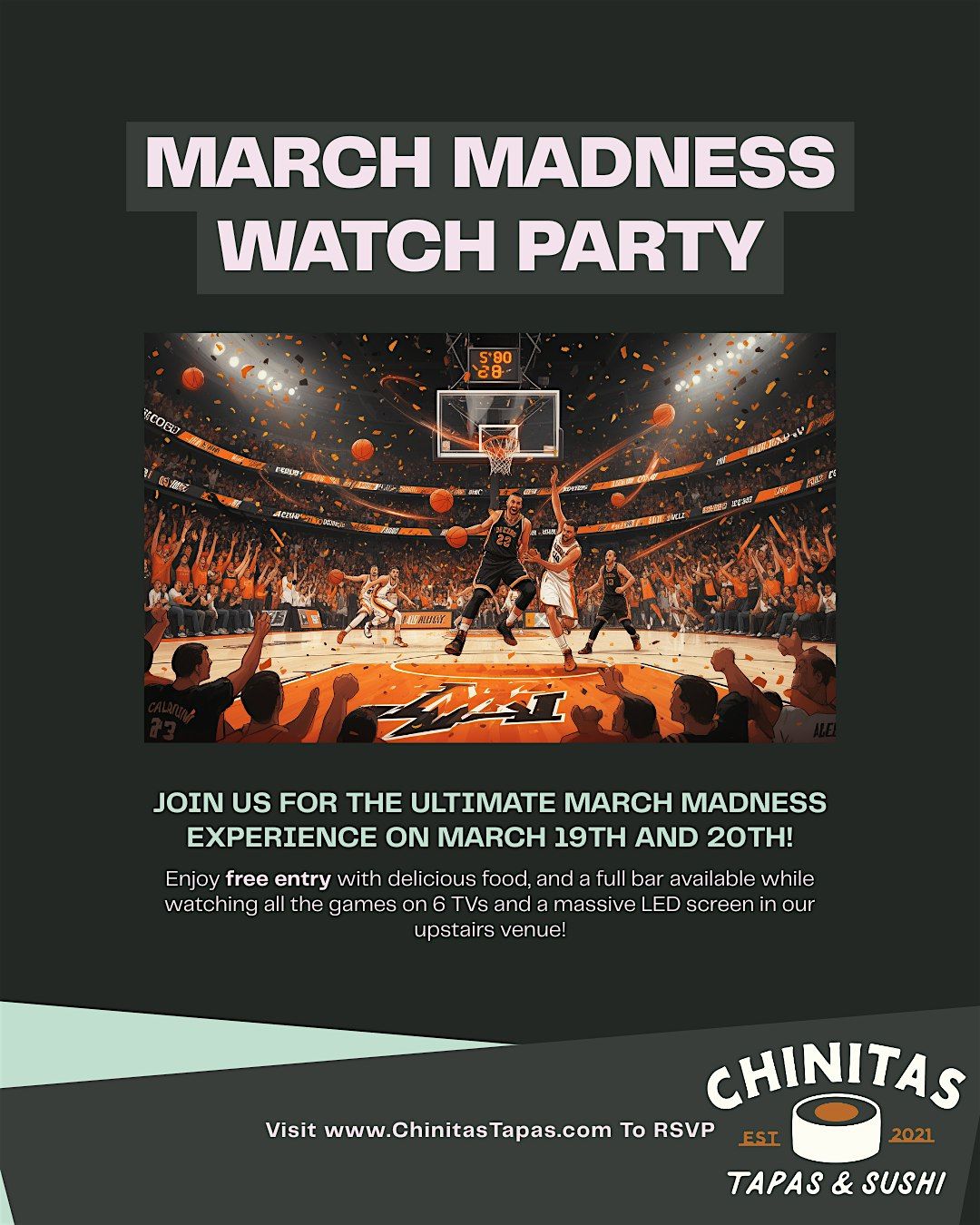 Join us for the ultimate March Madness Watch Party at Chinitas Tapas and Sushi! 📅 On March 19th and 20th, we invite basketball fans of all ages to experience the excitement of the first round of March Madness in our upstairs venue.