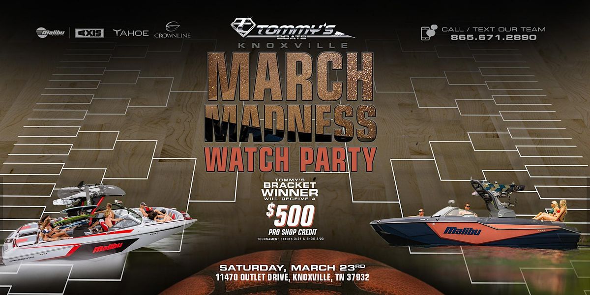 Come celebrate and have a good time with us on Saturday, March 23rd from 12pm-4pm for our March Madness Watch Party at Tommy's Knoxville. Watch the tournament, enjoy drinks and appetizers, and get exclusive savings! Play games & get giveaways, plus Tommy’s bracket challenge WINNER WILL RECEIVE A $500 Pro Shop Credit. March Madness Brackets will posted on Sunday, March 17th. Tournament starts Thursday, March 21 and ends Saturday, March 23rd. Get HUGE DEALS on brand new 2024 models from MALIBU, AXIS, CROWNLINE and TAHOE boats! Score up to 50% OFF select ski, wake, and surf gear & accessories. Fun for the whole family.