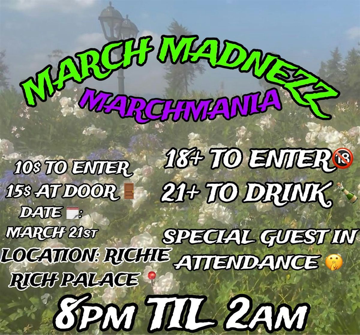 MARCH MADNEZZ: (marchmania) 18+ to enter 21+ to drink. FEMALES FREE FOR 1 HOUR . dress to impress.