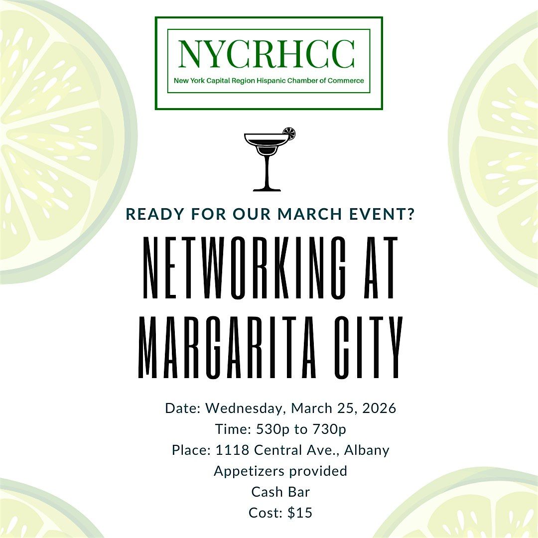 Join us for our first networking event of 2026 at Margarita City in Albany. Get ready to enjoy an evening of great networking, yummy appetizers and sumptuous drinks with all your friends from the Hispanic/Latino community.