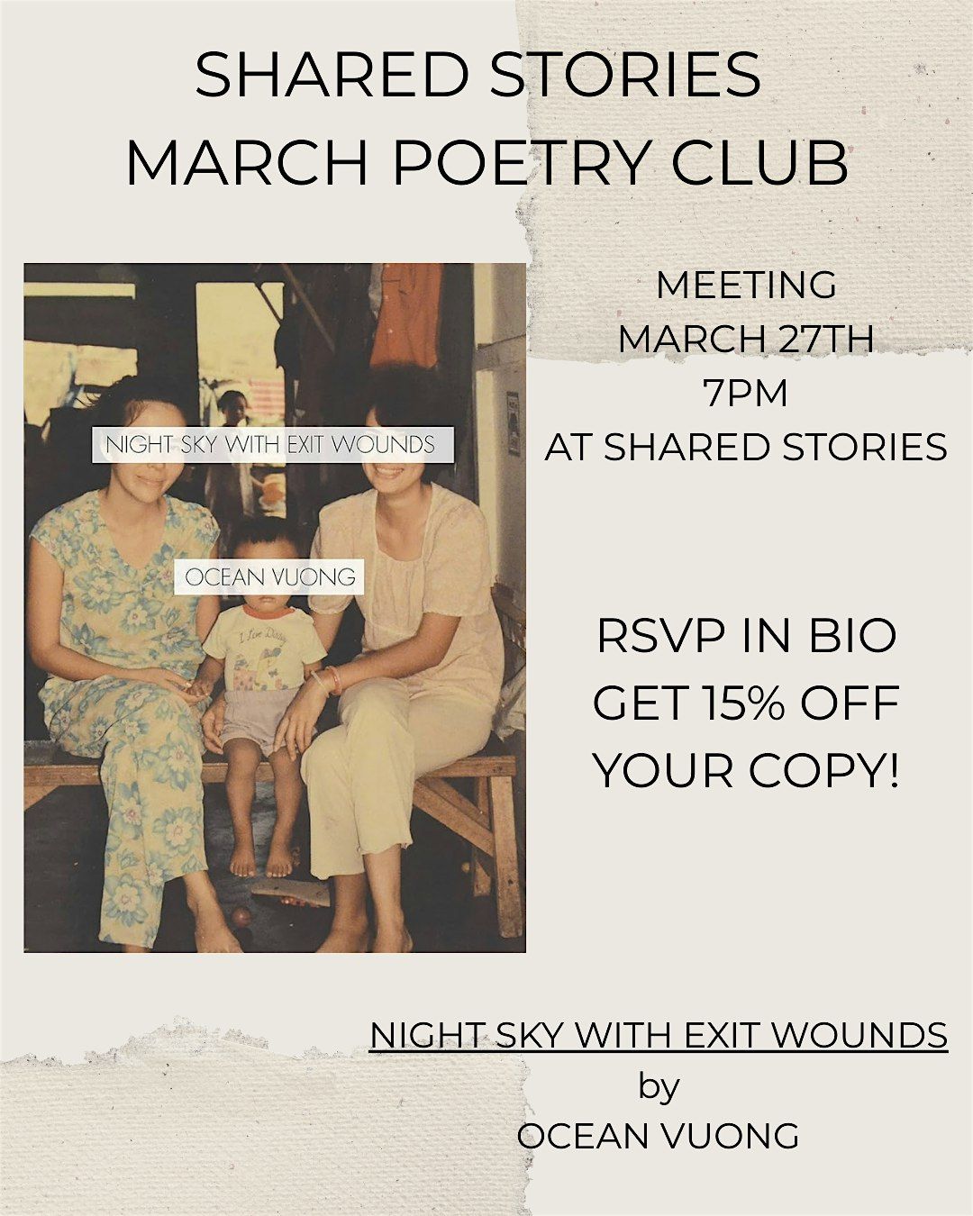 Poetry fans!! In March we are reading NIGHT SKY WITH EXIT WOUNDS - everyone is welcome! Bring your thoughts and a copy of the collection and get ready to gab with some lovely poets!