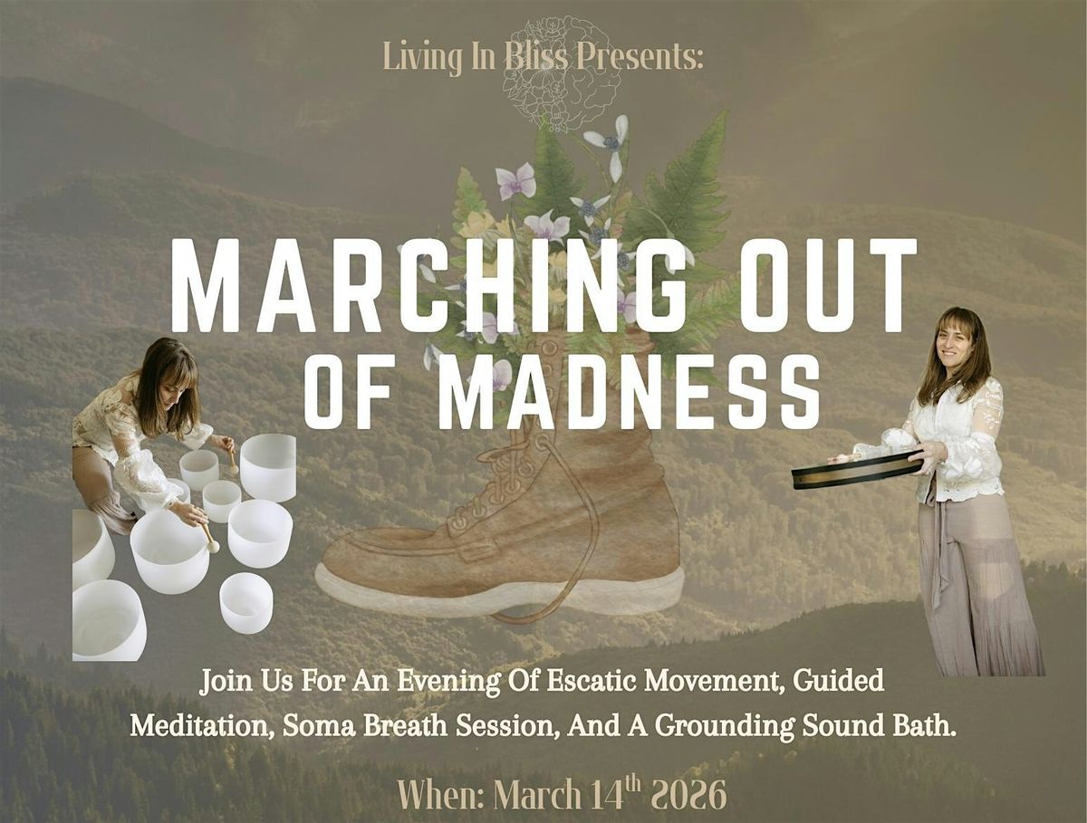 Join us for this 2 hour session filled with dancing, shaking, humming, guided "Marching Out Of Madness" meditation, and circular diaphragmatic breathing.