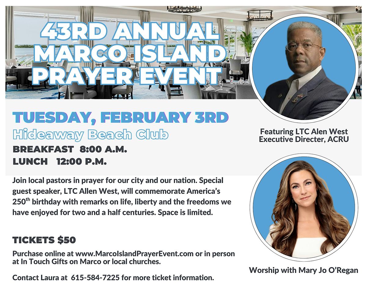 Join us for our Annual Marco Island Prayer Event! This year we are excited to have LTC Allen West as our special guest speaker.About this Event