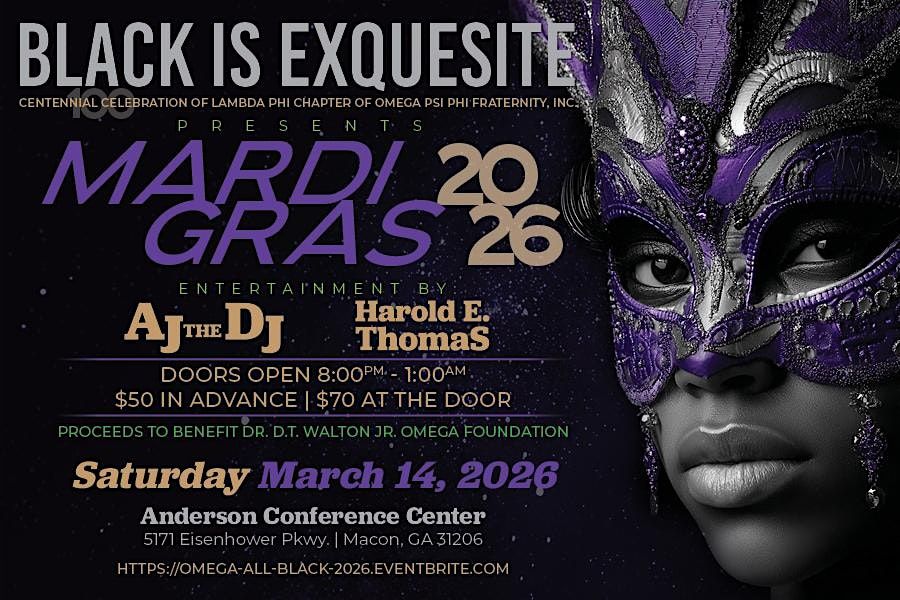 The Lambda Phi Ques will host Mardi Gras 2026 Omega All Black Party...Black Is ExQUEsite at Macon's Anderson Conference Center with heavy Hors d'oeuvres, cash bar and Macon's legendary AJ the DJ on the main floor and jazz musician Harold E. Thomas in the live Jazz lounge...plus an exclusive VIP lounge with DJ Amber, offering separate VIP food selection, relaxed restaurant style seating & a private bar with premium drink specials!!