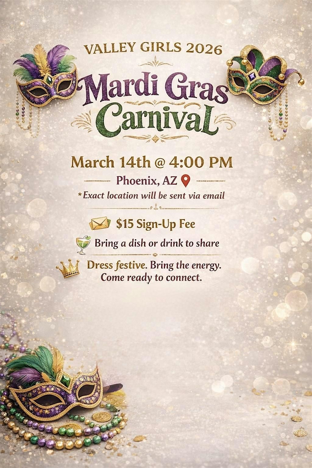 Get ready for an afternoon of fun, connection, and a little Mardi Gras magic with the Valley Girls! Join us as we bring the festive spirit of New Orleans to the Valley with good vibes, great company, and delicious food.