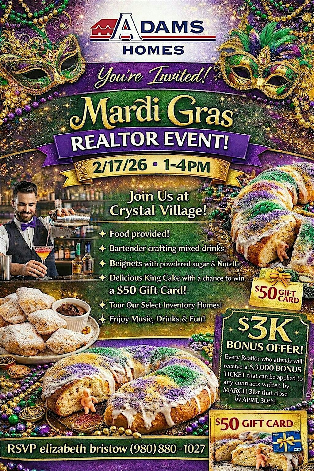 Mardi Gras + Real Estate = A Winning Combo! Join us for food, drinks, festive fun, and an exclusive $3,000 Realtor bonus opportunity.