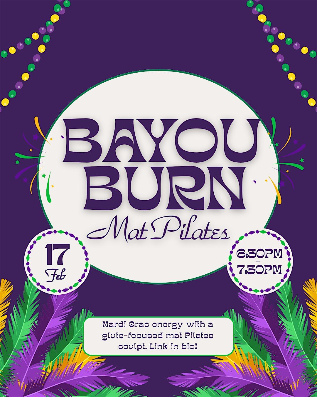Bayou Burn is an exclusive Mardi Gras–inspired mat Pilates experience set to New Orleans bounce and funky soul beats designed for an intentional, low-impact burn.