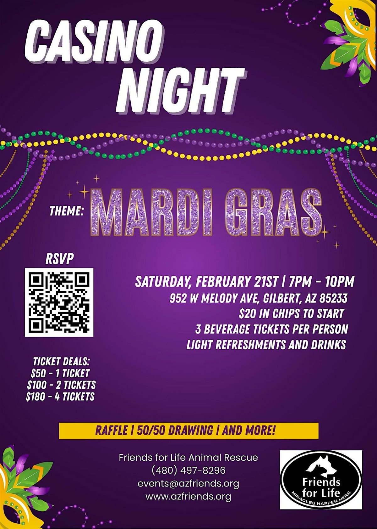 Join us for a Mardi Gras–themed Casino Night filled with games and refreshments and festive fun—all in support of Friends for Life!!About this Event