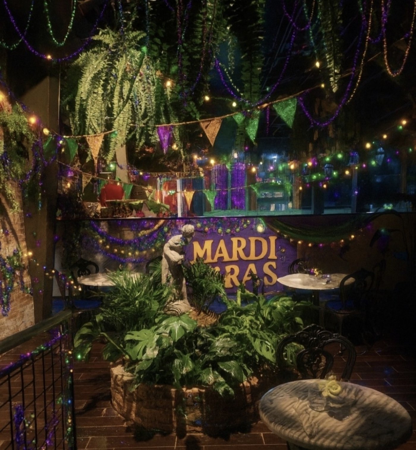 VIP Mardi Gras escape ½ block off Bourbon! Open bar, Cajun buffet, private restrooms & beads. Comfort + access.
