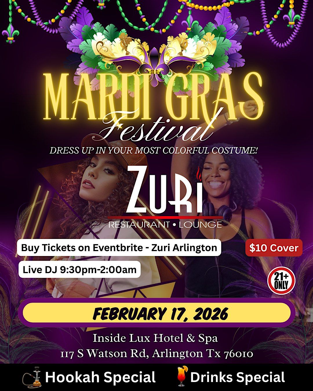 Celebrate Mardi Gras at Zuri! Live DJ, Hookah, Drinks & Costumes. Jan 17. 21+ Only. $10 Cover. Get tickets now!About this Event
