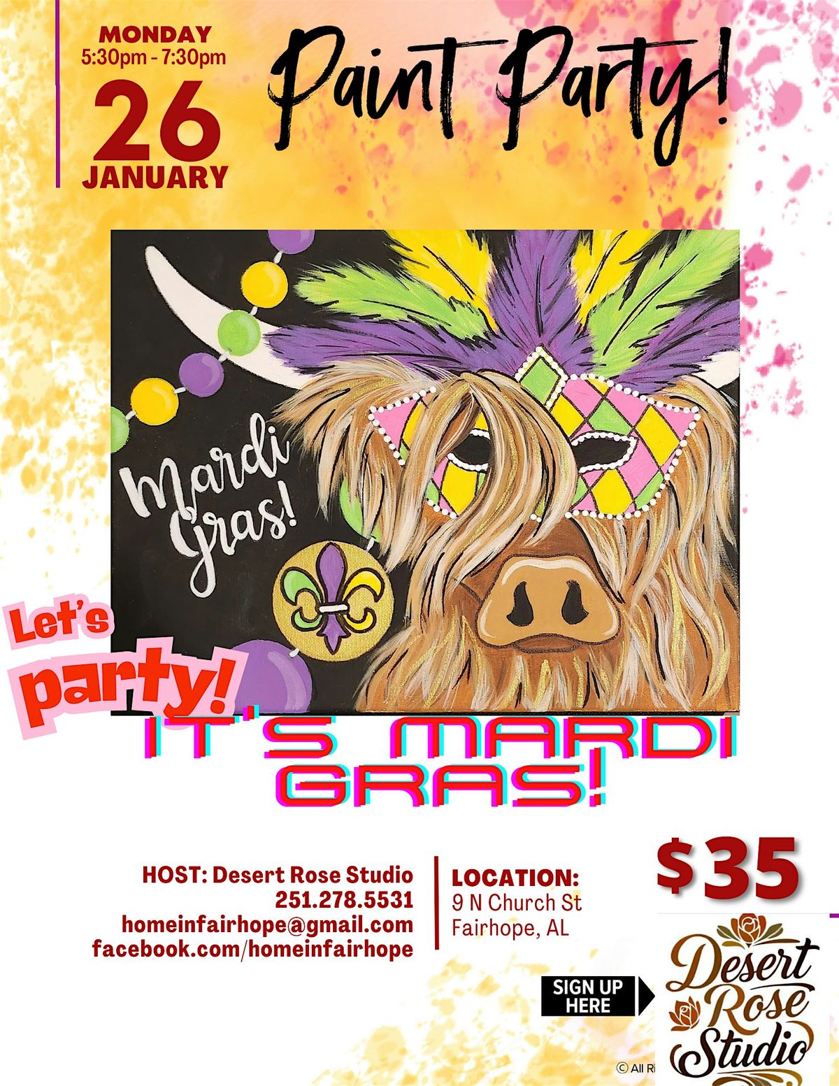 Get ready to unleash your inner artist at our Mardi Gras Highland Paint Party! Join us in person for a fun-filled evening of painting, laughter, and good vibes. No experience needed—just bring your creativity and festive spirit! We'll provide all the supplies, you bring the fun. Celebrate Mardi Gras like never before with colors, music, and great company. Don’t miss out on this colorful blast of joy!