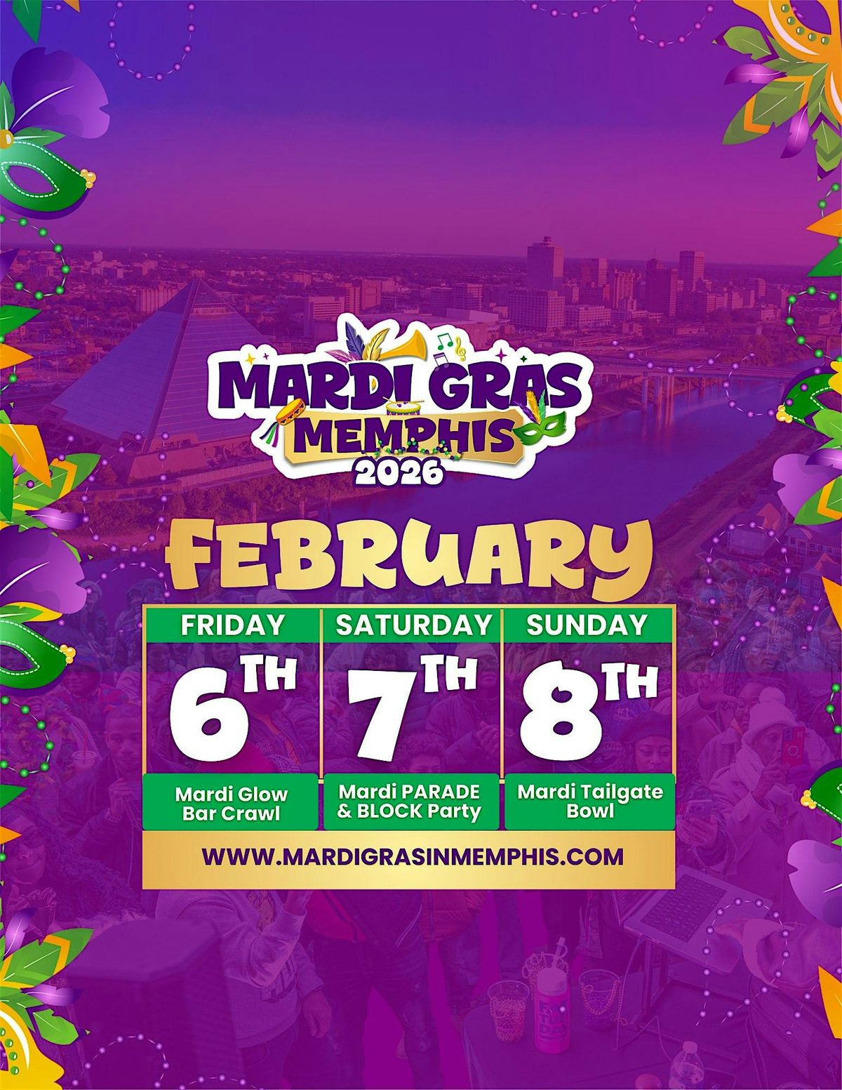 From February 6–8, Downtown Memphis transforms into a full festival experience with music, art, food, entertainment, and unforgettable moments. The weekend kicks off with our high-energy Mardi GLOW Bar Crawl, followed by Saturday’s FREE open to the Public Parade & Block Party featuring floats, marching bands, dance teams, vendors, family activities, and live performances. On Sunday, the Mardi Tailgate Bowl brings a fun and exciting community gathering, complete with food, vendors, and the Big Game shown on huge screens for everyone to enjoy.