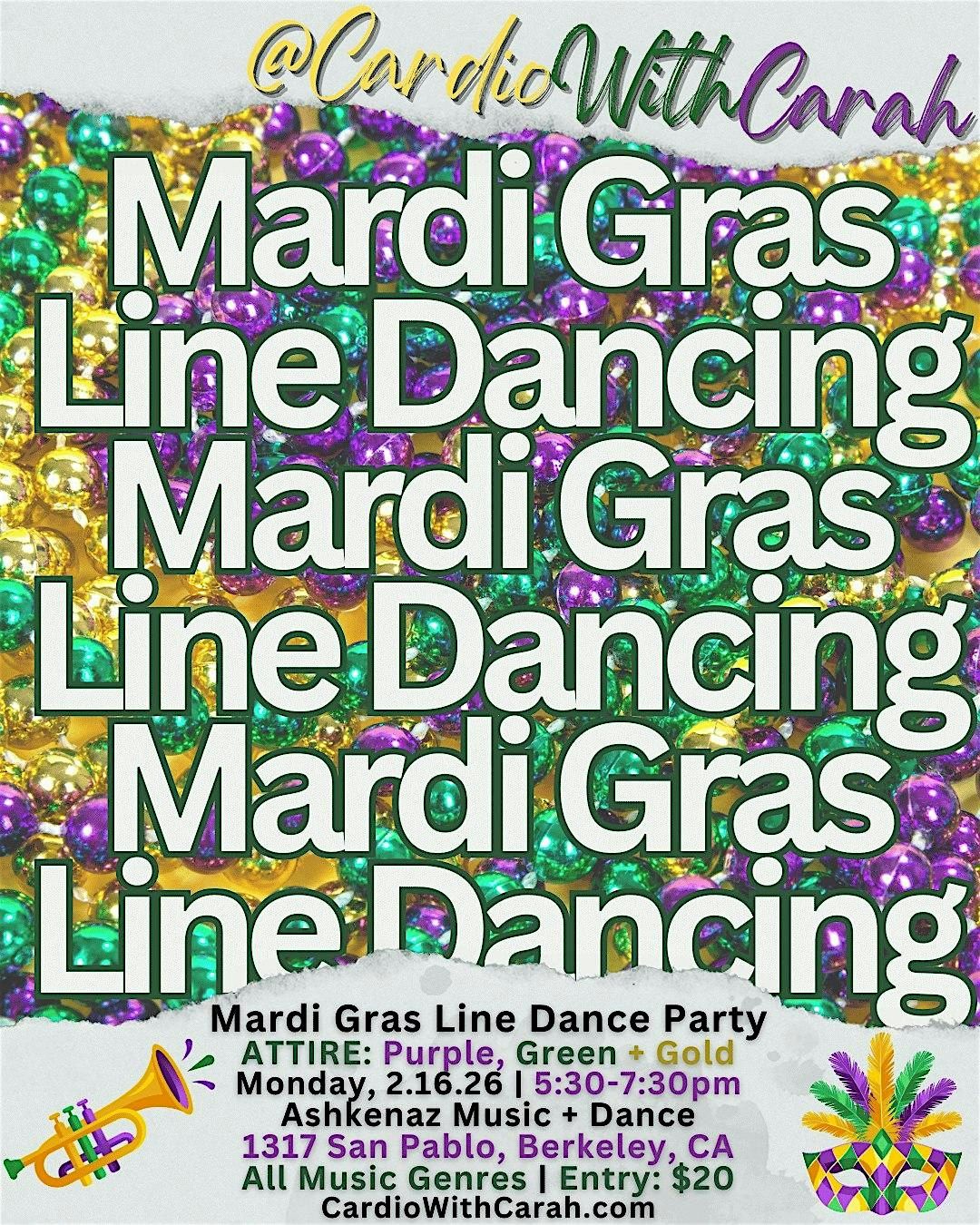 Join @CardioWithCarah for Line Dancing with a Mardi Gras twist. This 2-hour special indoor party is Monday, Feb. 16 from 5:30-7:30pm at Ashkenaz Music & Dance Community Center (1317 San Pablo, Berkeley, Calif). What time of line dancing? ALL GENRES! Country. RnB. Jazz. Hip Hop. Pop. Stay the entire time or stay for what you can. Class is weekly from 5:30-6:30pm. We extend the class times on holidays.