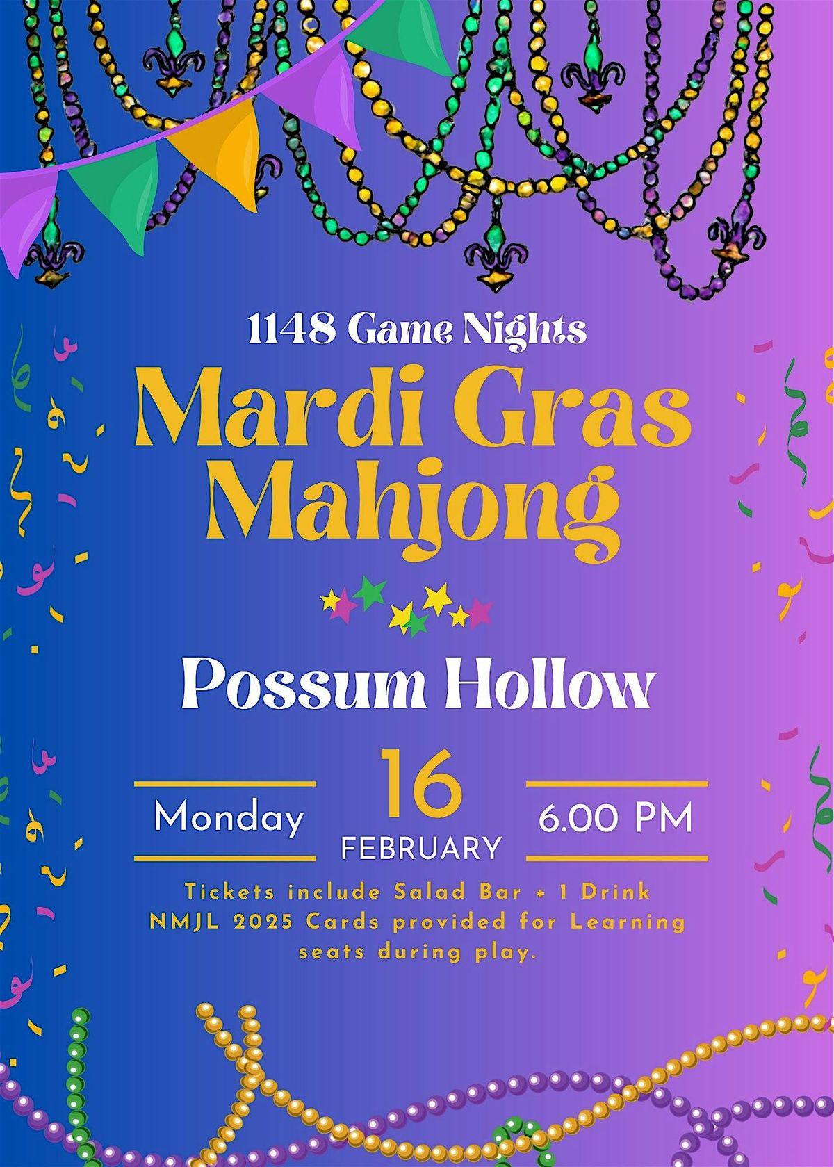 Let the good tiles roll! Join us for a festive Mardi Gras–themed Mahjong Night at Possum Hollow. Whether you’re brand new to Mahjong or a seasoned player, this cozy and social evening is designed to be welcoming, fun, and full of flair.