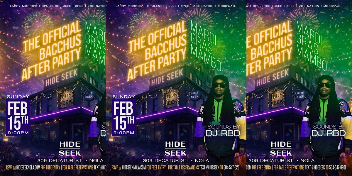 Join us for the Official Bacchus After Party at Hide | Seek featuring sounds by DJ RBD.About this Event