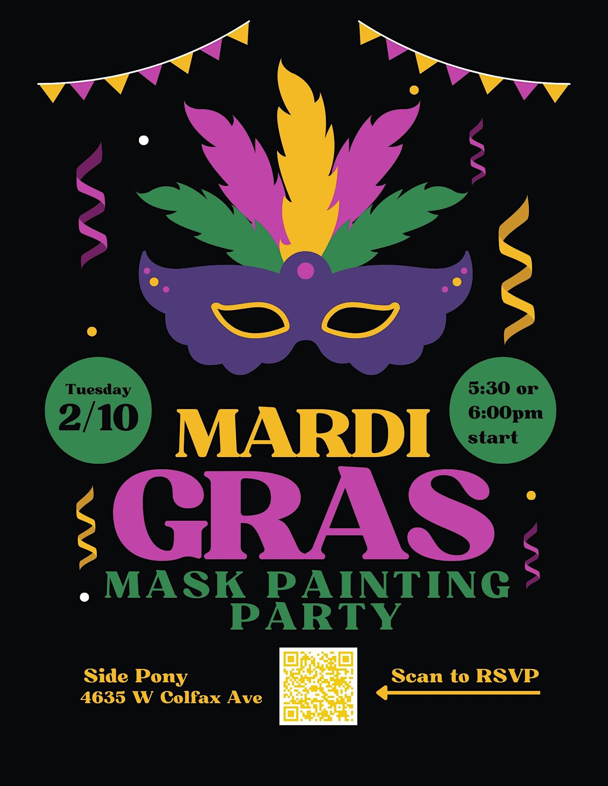 Your ticket includes admission for one guest, one Mardi Gras mask, and access to our decorating station stocked with gems and embellishments. All supplies, materials, and step-by-step instruction are provided—just bring your creativity.