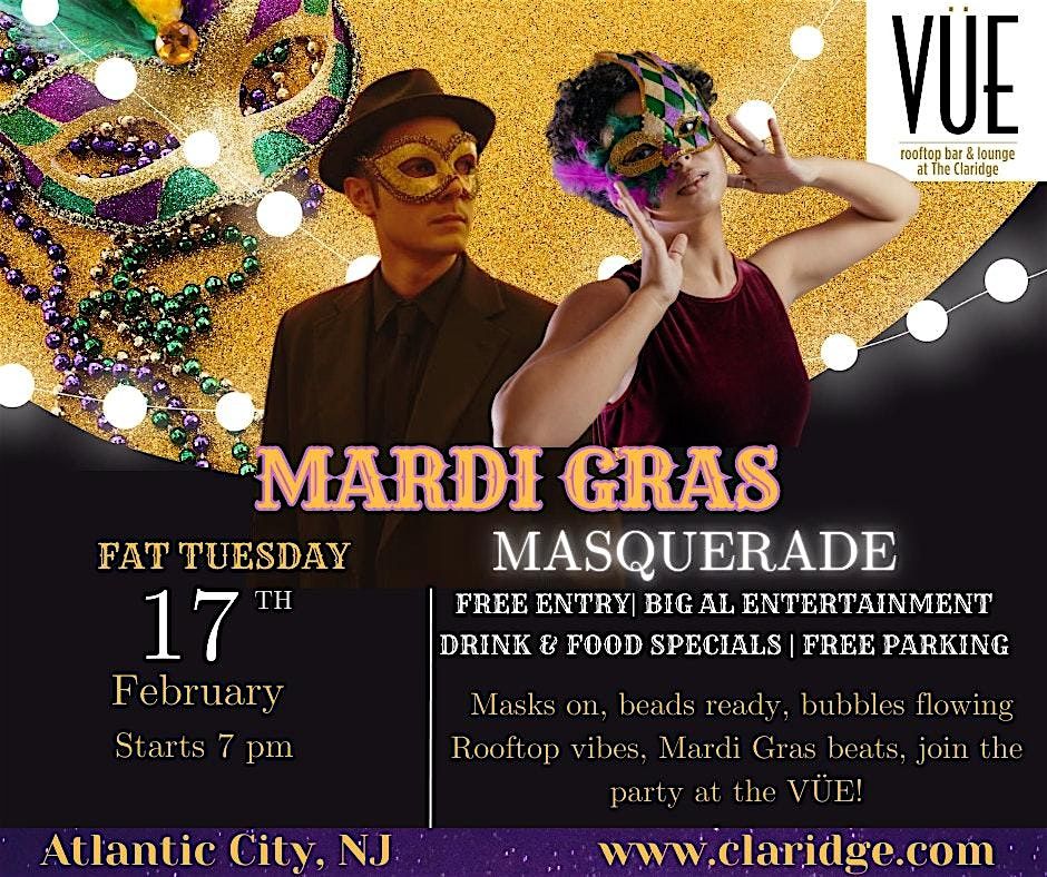 Celebrate Mardi Gras Masquerade at the VÜE Rooftop Bar & Lounge on Fat Tuesday, February 17, starting at 7 PM. Enjoy free entry!