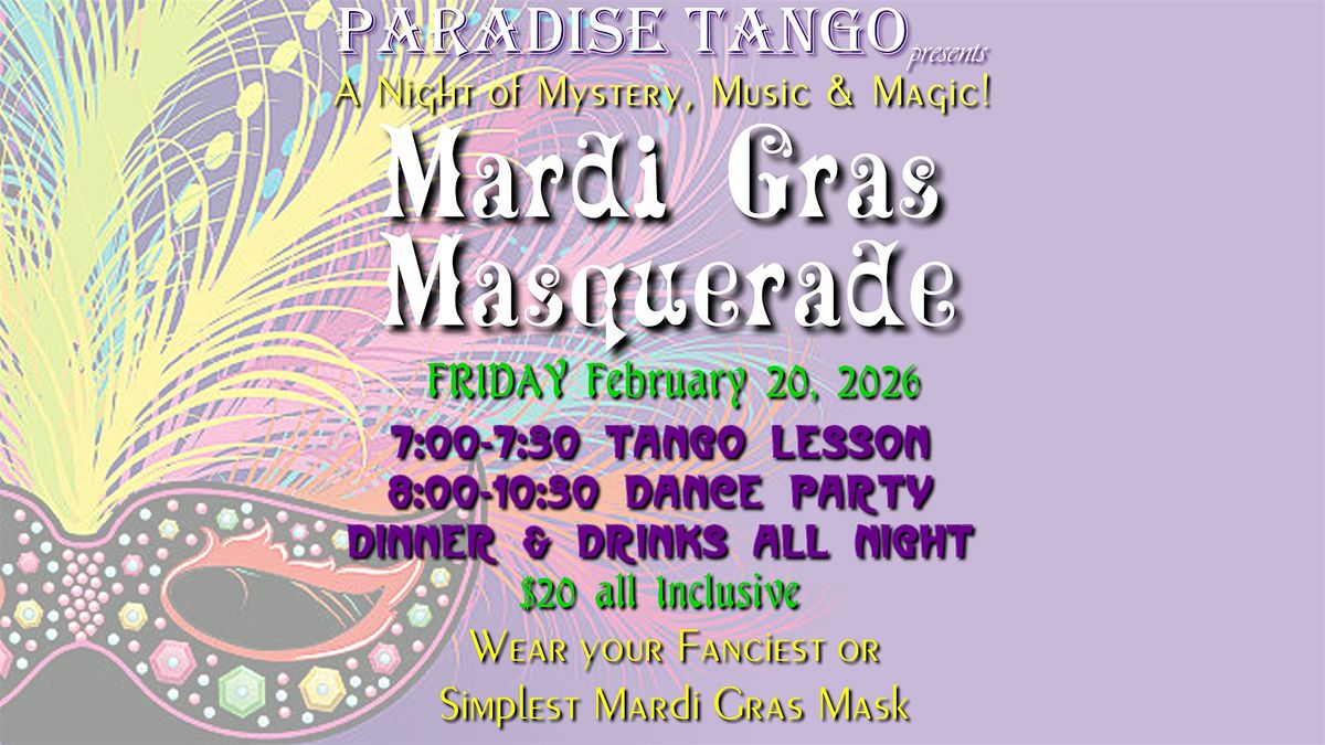 Step into the spirit of Mardi Gras with a night of masked elegance, lively rhythms, and New Orleans-inspired delights! Don your most dazzling masquerade mask (fancy, simple, or over-the-topโwhatever suits your flair!) and immerse yourself in an evening filled with delicious Creole-inspired treats, festive drinks, and the captivating energy of Argentine Tango!