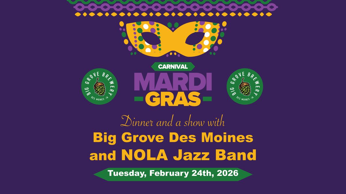 Come celebrate the Big Easy at Big Grove! Join us for an elevated Mardi Gras evening featuring a coursed culinary experience inspired by New Orleans, paired with the unmistakable sound of live jazz from the sensational NOLA Jazz Band. They’ve brought the house down the past few years, and we’re thrilled to welcome them back—bringing a little Cajun soul and plenty of rhythm with them.