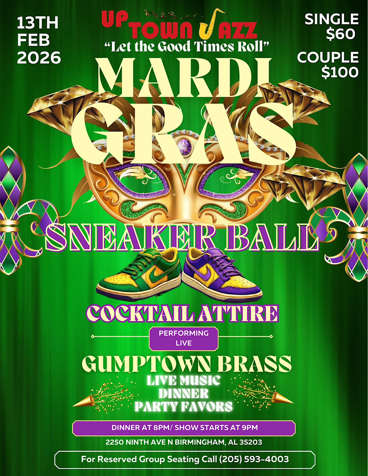 Welcome to the MARDI GRAS SNEAKER BALL at Uptown Jazz Lounge! Get ready to dance the night away and Let the Good Times Roll on February 13, 2026 at 8:00 PM. Join us for a night of music, fun, and of course, sneakers! Don't forget to wear your most stylish pair as we celebrate in style. See you there!