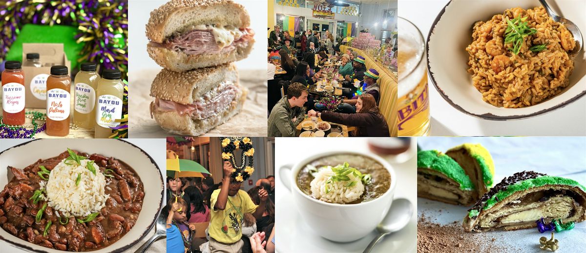 For FAT TUESDAY - February 17, 2026 - Bayou Bakery, Coffee Bar & Eatery transforms into a Bayou Gras Mardi Pardi from 5PM until 9PM with an ALL YOU CAN EAT + DRINK MENU [see below.] As the DMV's only Mardi Gras Headquarters, New Orleans Native Chef David Guas offers authentic Parade Food + Drink and LIVE JAZZ MUSIC from The District Brass Band. Bayou Bakery will be open with regular service with Mardi Gras specials to capture the spirit of the day from 7AM-4PM [closed from 4PM-5PM to get ready for the Mardi Pardi!]
