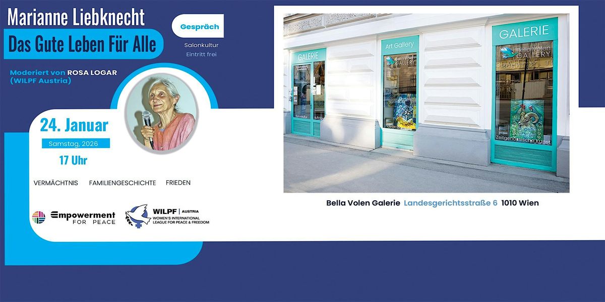 Marianne Liebknecht, war Tänzerin und ist Enkelin des politischen Denkers und Revolutionärs Karl Liebknecht, als auch Tochter des Malers Robert Liebknecht. Sie spricht über ihre Familiengeschichte und deren Bedeutung für die Gegenwart. Ausgehend von persönlichen Erinnerungen spannt sie den Bogen zu Fragen von Kunst und Kultur sowie zu ihrem Manifest des Guten Lebens für alle – als gesellschaftliche Vision, politische Haltung und kulturelle Praxis.