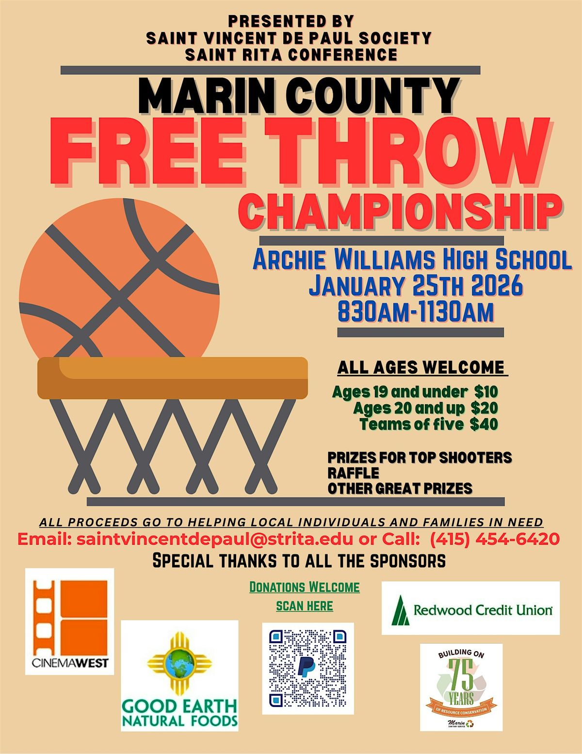 Annual Marin County Free Throw Championship - Sunday January 25, 2026 @ Archie Williams High School - San Anselmo: 8:30am - 11:30amAbout this Event